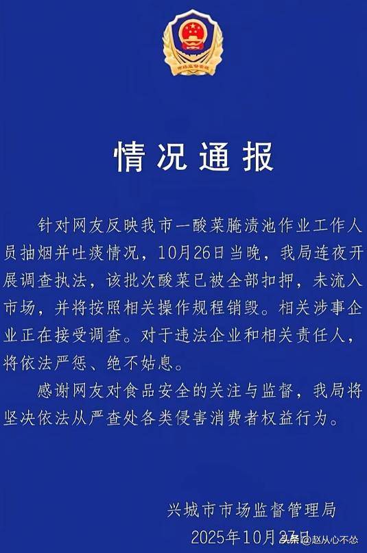 一段仅30秒的影像让全网曲呼反胃——画面里,腌制池旁的工人随手扔掉翻菜的铁叉,掏出喷鼻烟点燃后安闲吸食,更令人难以接管的是,他竟然间接朝酸菜池吐了一口痰,随后抬脚试图抹去踪迹。